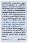 As I turned to walk away, He spoke to my heart again and said, “Tell someone about me.” Since then, one second hasn’t gone by in my life that I haven’t believed that Jesus paid my sin debt on the cross and rose to life again in 3 days. I am a forgiven sinner. Jesus loves you and died on the cross for you. Believe that he rose again and allow Him to be Lord of your life.