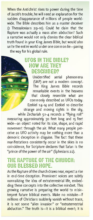 When the Antichrist rises to power during the time of Jacob’s trouble, he will need an explanation for the sudden disappearance of millions of people worldwide. The Bible describes him as a master deceiver (2 Thessalonians 2:9–10). Could he claim that the Rapture was actually a mass alien abduction? Such a narrative would not only dismiss the clear biblical truth found in your King James Bible, but would also unite the entire world under one common lie—paving the way for his global rule.