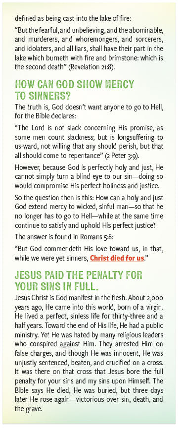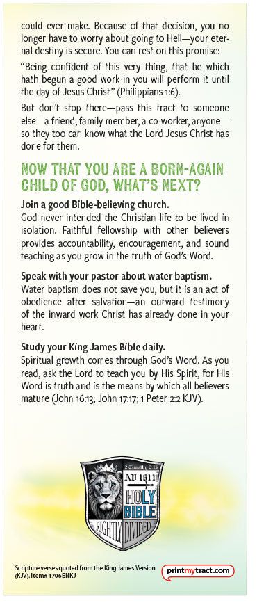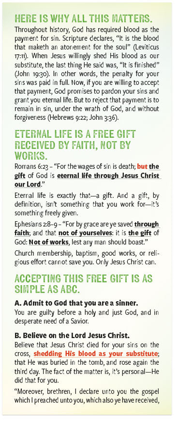 The full text of this flyer tract is shown below in the KJV version. (Do you want to print this tract in a different version than the one listed? Contact us and let us know what you're looking for—we may be able to create the alternate version for you at no charge.)