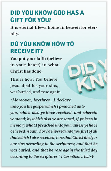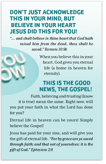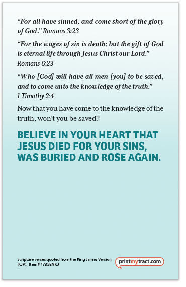 The full text of this tract is shown below in the KJV version. (Do you want to print this tract in a different version than the one listed? Contact us and let us know what you're looking for—we may be able to create the alternate version for you at no charge.)