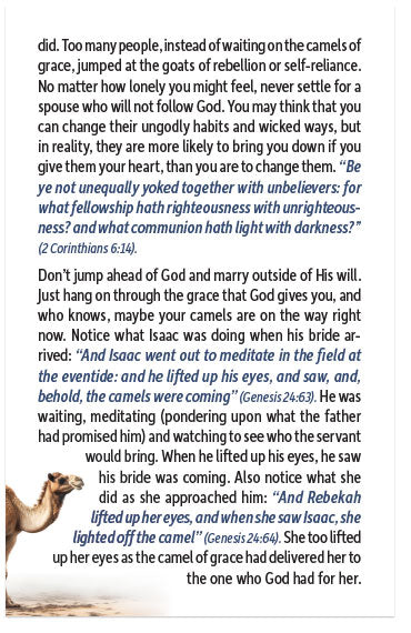 Waiting is never easy, and because of this many have gotten ahead of God or disregarded His warnings and had to suffer the consequences of their decisions. When it comes to waiting, the camels in Genesis 24 also play an important role. The camel in typology represents grace. In the biblical account the servant had to wait until he found the one willing to water the camels and willing to follow him back to his master. Isaac had to wait until the camels returned, bringing his bride home. So, in this we see it takes grace to wait upon the Lord. No matter how hard waiting might be, it’s always easier than wishing that you did. Too many people, instead of waiting on the camels of grace, jumped at the goats of rebellion or self-reliance. No matter how lonely you might feel, never settle for a spouse who will not follow God. You may think that you can change their ungodly habits and wicked ways, but in reality, they are more likely to bring you down if you give them your heart, than you are to change them. “Be ye not unequally yoked together with unbelievers: for what fellowship hath righteousness with unrighteousness? and what communion hath light with darkness?” (2 Corinthians 6:14).