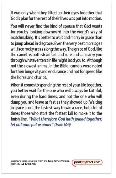 You will never find the kind of spouse that God wants for you by looking downward into the world’s way of matchmaking. It’s better to wait and marry in grace than to jump ahead in disgrace. Even the very best marriages will face rocky areas along the way. The grace of God, like the camel, is both steadfast and sure and can carry you through whatever terrain life might lead you to. Although not the slowest animal in the Bible, camels were noted for their longevity and endurance and not for speed like the horse and chariot.