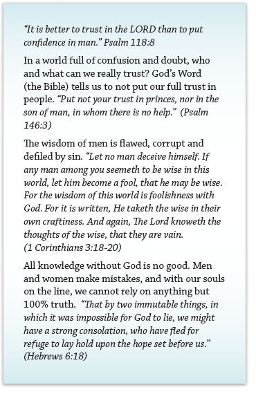 In a world full of confusion and doubt, who and what can we really trust? God’s Word (the Bible) tells us to not put our full trust in people. “Put not your trust in princes, nor in the son of man, in whom there is no help.” (Psalm 146:3)