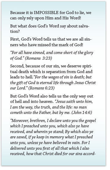 But God’s Word also tells us the only way out of hell and into heaven. “Jesus saith unto him, I am the way, the truth, and the life: no man cometh unto the Father, but by me. (John 14:6)