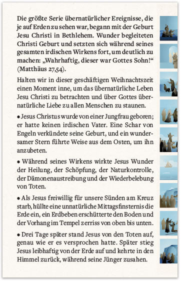 Die größte Serie übernatürlicher Ereignisse, die je auf Erden zu sehen war, begann mit der Geburt Jesu Christi in Bethlehem. Wunder begleiteten Christi Geburt und setzten sich während seines gesamten irdischen Wirkens fort, um deutlich zu machen: „Wahrhaftig, dieser war Gottes Sohn!“ (Matthäus 27,54).