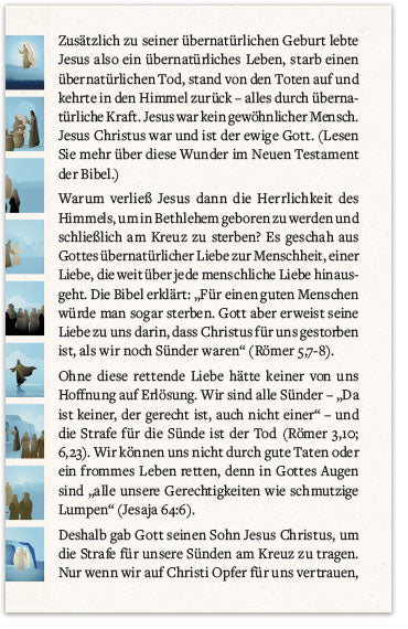 Warum verließ Jesus dann die Herrlichkeit des Himmels, um in Bethlehem geboren zu werden und schließlich am Kreuz zu sterben? Es geschah aus Gottes übernatürlicher Liebe zur Menschheit, einer Liebe, die weit über jede menschliche Liebe hinausgeht. Die Bibel erklärt: „Für einen guten Menschen würde man sogar sterben. Gott aber erweist seine Liebe zu uns darin, dass Christus für uns gestorben ist, als wir noch Sünder waren“ (Römer 5,7-8).