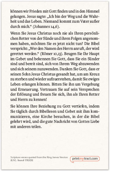 Deshalb gab Gott seinen Sohn Jesus Christus, um die Strafe für unsere Sünden am Kreuz zu tragen. Nur wenn wir auf Christi Opfer für uns vertrauen, können wir Frieden mit Gott finden und in den Himmel gelangen. Jesus sagte: „Ich bin der Weg und die Wahrheit und das Leben. Niemand kommt zum Vater außer durch mich.“ (Johannes 14,6).