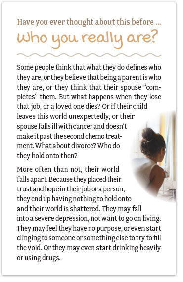 Some people think that what they do defines who they are, or they believe that being a parent is who they are, or they think that their spouse “completes” them. But what happens when they lose that job, or a loved one dies? Or if their child leaves this world unexpectedly, or their spouse falls ill with cancer and doesn’t make it past the second chemo treatment. What about divorce? Who do they hold onto then?