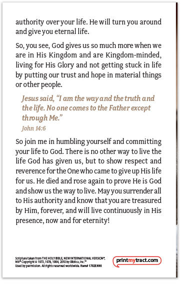The full text of this tract is shown below in the NIV version. (Do you want to print this tract in a different version than the one listed? Contact us and let us know what you're looking for—we may be able to create the alternate version for you at no charge.)