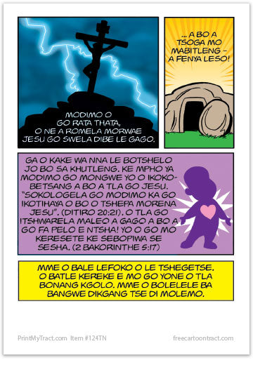 This excellent tract can be previewed at the author's website here (link opens in new window). In addition to the print-on-demand languages and quantities available here through PrintMyTract.com, printed copies are in stock and available from Living Waters for the English version.