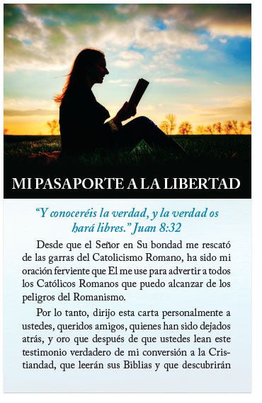 Como Católica Romana anteriormente, creía todo lo que se me enseñó hasta que el Espíritu Santo me instó a escudriñar las Escrituras (Hec-hos 17:11) ese día que encontré el boletín de la Iglesia Católica Romana. Como Católica, estaba muerta espiritualmente porque en el profundo de mi corazón, sabía que nunca podría alcanzar el cielo. Nunca podría ser suficiente buena para ver a Dios. La vida eterna se obtiene solamente por la fe. Esto es el regalo de Dios a sus hijos, librados por Jesús en el Calvario. Tiemblo al pensar en el juicio venidero para los millones que todavía están en las garras del Catolicismo Romano. Oro que la ceguera causada por Satanás será removida de los ojos y de la mente de los Católicos Romanos leyendo este tratado.