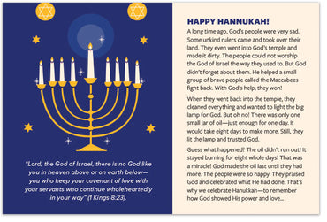 Guess what happened? The oil didn’t run out! It stayed burning for eight whole days! That was a miracle! God made the oil last until they had more. The people were so happy. They praised God and celebrated what He had done. That’s why we celebrate Hanukkah—to remember how God showed His power and love…