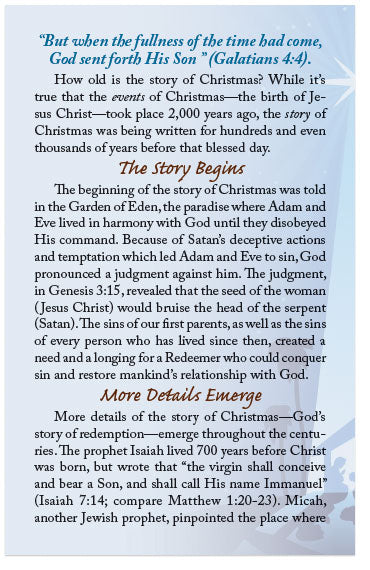 The beginning of the story of Christmas was told in the Garden of Eden, the paradise where Adam and Eve lived in harmony with God until they disobeyed His command. Because of Satan’s deceptive actions and temptation which led Adam and Eve to sin, God pronounced a judgment against him. The judgment, in Genesis 3:15, revealed that the seed of the woman (Jesus Christ) would bruise the head of the serpent (Satan). The sins of our first parents, as well as the sins of every person who has lived since then, created a need and a longing for a Redeemer who could conquer sin and restore mankind’s relationship with God.