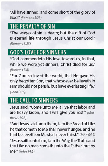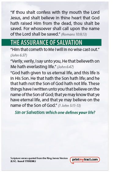 The full text of this tract is shown below in the KJV version. (Do you want to print this tract in a different version than the one listed? Contact us and let us know what you're looking for—we may be able to create the alternate version for you at no charge.)