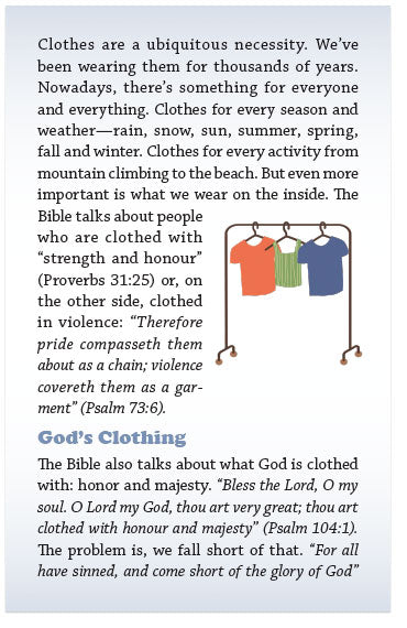 Clothes are a ubiquitous necessity. We’ve been wearing them for thousands of years. Nowadays, there’s something for everyone and everything. Clothes for every season and weather—rain, snow, sun, summer, spring, fall and winter. Clothes for every activity from mountain climbing to the beach. But even more important is what we wear on the inside. The Bible talks about people who are clothed with “strength and honour” (Proverbs 31:25) or, on the other side, clothed in violence: “Therefore pride compasseth them about as a chain; violence covereth them as a garment” (Psalm 73:6).