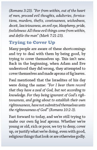 Many people are aware of these shortcomings and try to deal with them by being good, by trying to cover themselves up. This isn’t new. Back in the beginning, when Adam and Eve understood they did wrong, they attempted to cover themselves and made aprons of fig leaves.
