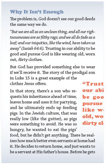“But we are all as an unclean thing, and all our righteousnesses are as filthy rags; and we all do fade as a leaf; and our iniquities, like the wind, have taken us away” (Isaiah 64:6). Trusting in our ability to be good and pursue God is like wearing old, worn out, dirty clothes.