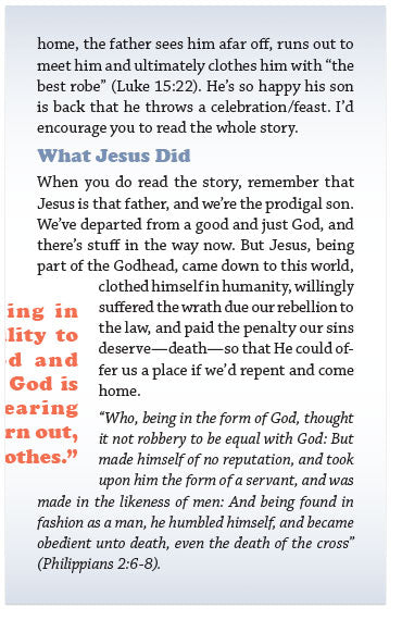 When you do read the story, remember that Jesus is that father, and we’re the prodigal son. We’ve departed from a good and just God, and there’s stuff in the way now. But Jesus, being part of the Godhead, came down to this world, clothed himself in humanity, willingly suffered the wrath due our rebellion to the law, and paid the penalty our sins deserve—death—so that He could offer us a place if we’d repent and come home.