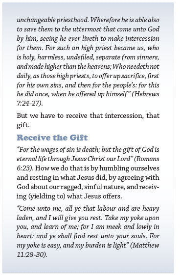 “But this man, because he continueth ever, hath an unchangeable priesthood. Wherefore he is able also to save them to the uttermost that come unto God by him, seeing he ever liveth to make intercession for them. For such an high priest became us, who is holy, harmless, undefiled, separate from sinners, and made higher than the heavens; Who needeth not daily, as those high priests, to offer up sacrifice, first for his own sins, and then for the people’s: for this he did once, when he offered up himself” (Hebrews 7:24-27).