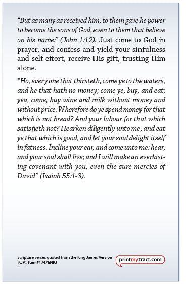 The full text of this tract is shown below in the KJV version. (Do you want to print this tract in a different version than the one listed? Contact us and let us know what you're looking for—we may be able to create the alternate version for you at no charge.)
