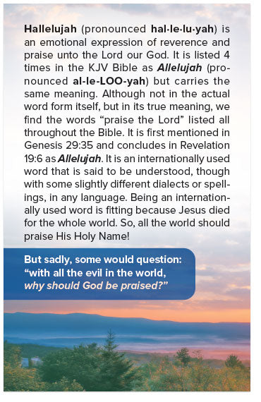 Hallelujah (pronounced hal·le·lu·yah) is an emotional expression of reverence and praise unto the Lord our God. It is listed 4 times in the KJV Bible as Allelujah (pronounced al-le-LOO-yah) but carries the same meaning. Although not in the actual word form itself, but in its true meaning, we find the words “praise the Lord” listed all throughout the Bible. It is first mentioned in Genesis 29:35 and concludes in Revelation 19:6 as Allelujah. It is an internationally used word that is said to be understood, though with some slightly different dialects or spellings, in any language. Being an internationally used word is fitting because Jesus died for the whole world. So, all the world should praise His Holy Name!