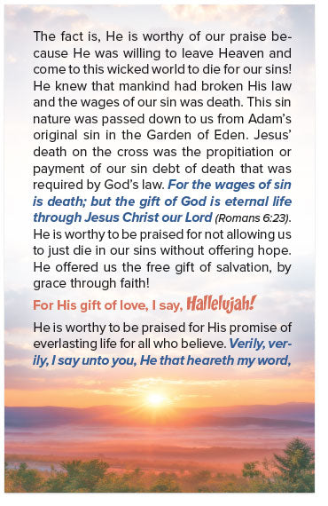 The fact is, He is worthy of our praise because He was willing to leave Heaven and come to this wicked world to die for our sins! He knew that mankind had broken His law and the wages of our sin was death. This sin nature was passed down to us from Adam’s original sin in the Garden of Eden. Jesus’ death on the cross was the propitiation or payment of our sin debt of death that was required by God’s law. For the wages of sin is death; but the gift of God is eternal life through Jesus Christ our Lord (Romans 6:23). He is worthy to be praised for not allowing us to just die in our sins without offering hope. He offered us the free gift of salvation, by grace through faith!
