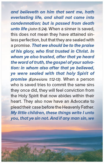 He is worthy to be praised for His promise of everlasting life for all who believe. Verily, verily, I say unto you, He that heareth my word, and believeth on him that sent me, hath everlasting life, and shall not come into condemnation; but is passed from death unto life (John 5:24). When a sinner is saved, this does not mean they have attained sinless perfection, but that they are sealed with a promise. That we should be to the praise of his glory, who first trusted in Christ. In whom ye also trusted, after that ye heard the word of truth, the gospel of your salvation: in whom also after that ye believed, ye were sealed with that holy Spirit of promise (Ephesians 1:12-13). When a person who is saved tries to commit the same sins they once did, they will feel conviction from the Holy Spirit that now abides within their heart. They also now have an Advocate to plead their case before the Heavenly Father. My little children, these things write I unto you, that ye sin not. And if any man sin, we have an advocate with the Father, Jesus Christ the righteous (1 John 2:1).