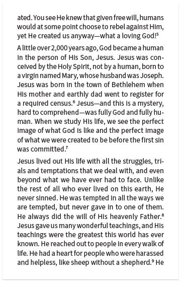 A little over 2,000 years ago, God became a human in the person of His Son, Jesus. Jesus was conceived by the Holy Spirit, not by a human, born to a virgin named Mary, whose husband was Joseph. Jesus was born in the town of Bethlehem when His mother and earthly dad went to register for a required census.6 Jesus—and this is a mystery, hard to comprehend—was fully God and fully human. When we study His life, we see the perfect image of what God is like and the perfect image of what we were created to be before the first sin was committed.7