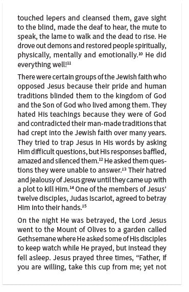 Jesus lived out His life with all the struggles, trials and temptations that we deal with, and even beyond what we have ever had to face. Unlike the rest of all who ever lived on this earth, He never sinned. He was tempted in all the ways we are tempted, but never gave in to one of them. He always did the will of His heavenly Father.8 Jesus gave us many wonderful teachings, and His teachings were the greatest this world has ever known. He reached out to people in every walk of life. He had a heart for people who were harassed and helpless, like sheep without a shepherd.9 He touched lepers and cleansed them, gave sight to the blind, made the deaf to hear, the mute to speak, the lame to walk and the dead to rise. He drove out demons and restored people spiritually, physically, mentally and emotionally.10 He did everything well!11