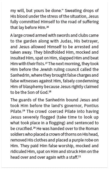 The guards of the Sanhedrin bound Jesus and took Him before the land’s governor, Pontius Pilate.19 The crowd coerced Pilate into having Jesus severely flogged (take time to look up what took place in a flogging) and sentenced to be crucified.20 He was handed over to the Roman soldiers who placed a crown of thorns on His head, removed His clothes and placed a purple robe on Him. They paid Him false worship, mocked and ridiculed Him, spat on Him and struck Him on the head over and over again with a staff.21