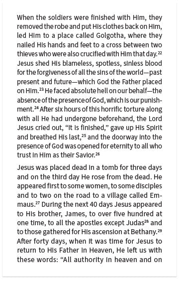 When the soldiers were finished with Him, they removed the robe and put His clothes back on Him, led Him to a place called Golgotha, where they nailed His hands and feet to a cross between two thieves who were also crucified with Him that day.22 Jesus shed His blameless, spotless, sinless blood for the forgiveness of all the sins of the world—past present and future—which God the Father placed on Him.23 He faced absolute hell on our behalf—the absence of the presence of God, which is our punishment.24 After six hours of this horrific torture along with all He had undergone beforehand, the Lord Jesus cried out, “It is finished,” gave up His Spirit and breathed His last,25 and the doorway into the presence of God was opened for eternity to all who trust in Him as their Savior.26