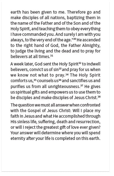 A week later, God sent the Holy Spirit32 to indwell believers, convict us of sin33 and pray for us when we know not what to pray.34 The Holy Spirit comforts us,35 counsels us36 and sanctifies us and purifies us from all unrighteousness.37 He gives us spiritual gifts and empowers us to use them to be disciples and make disciples of Jesus Christ.38
